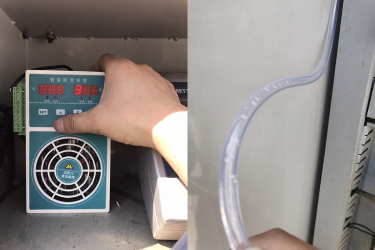 智能除濕裝置采用半導(dǎo)體制冷除濕方式,自動(dòng)將密閉空間的潮濕空氣在風(fēng)扇的作用下吸入除濕風(fēng)道,空氣中的水汽經(jīng)過半導(dǎo)體制冷機(jī)構(gòu)后冷凝成水,再通過導(dǎo)水管排出柜體,除濕效果顯著,對(duì)收費(fèi)車道計(jì)量稱重設(shè)備起到保護(hù)作用。